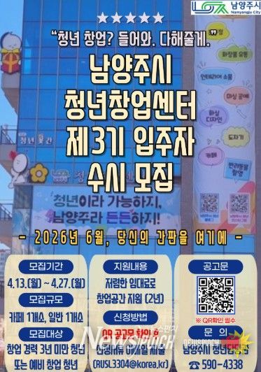 모집 기간은 4월 13일부터 4월 27일 오후 6시까지다. 신청을 희망하는 청년은 사업계획서 및 관련 서류를 남양주시 청년담당관 담당자 전자우편으로 제출하면 된다.