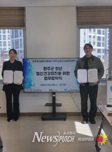 뉴스펀치 정홍균 기자 | 완주청년종합지원센터가 완주군정신건강복지센터와 손을 잡고 지역 청년들의 정신건강 증진과 삶의 질 향상을 위한 업무 협약을 체결했다.