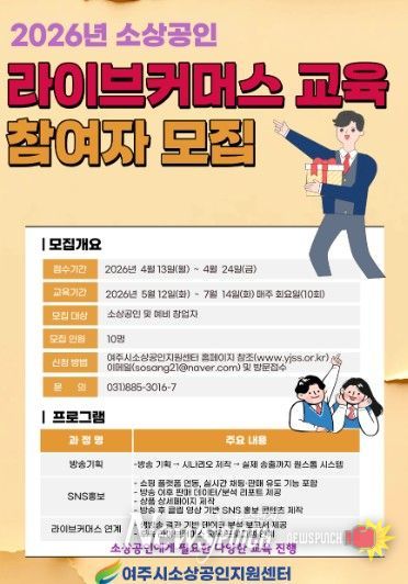 뉴스펀치 박상훈 기자 | 여주시소상공인지원센터는 관내 소상공인 및 예비창업자의 온라인 판로 확대와 매출 증대를 지원하기 위해 ‘라이브커머스 참여업체’를 모집한다고 밝혔다.