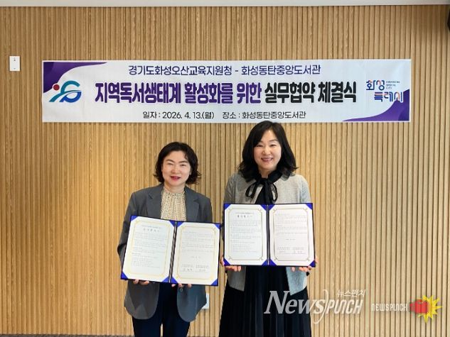 뉴스펀치 박상훈 기자 | 화성특례시 화성동탄중앙도서관은 화성오산교육지원청과 13일 화성동탄중앙도서관에서 독서문화진흥 및 상호 협력을 위한 실무협약을 체결했다.