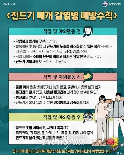진드기 매개 감염병의 주요 예방수칙은 ▲농작업 시 긴 옷 착용하여 피부 노출하지 않기 ▲기피제 사용하기 ▲풀밭 위에 옷 벗어두거나 눕지 않기 ▲외출 후 샤워하기 ▲입었던 옷 세탁하기 ▲몸에 진드기 붙어 있는지 꼼꼼히 확인하기 등이 있다.