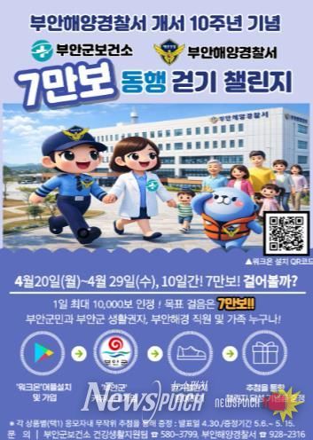 뉴스펀치 최영남 기자 | 부안군보건소는 개서 10주년을 맞은 부안해양경찰서와 함께 군민 건강 증진을 위한 참여형 생활 건강 행사 ‘7만 보 동행 걷기 챌린지’를 공동 추진한다고 밝혔다.