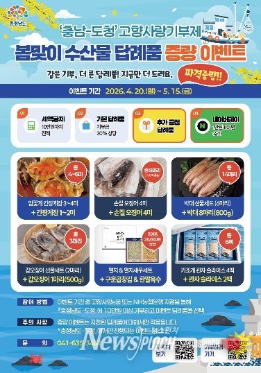 뉴스펀치 강영선 기자 | 충남도는 오는 20일부터 5월 15일까지 지역 수산물 소비 촉진 및 고향사랑기부제 활성화를 위한 ‘답례품 증량 이벤트’를 진행한다고 16일 밝혔다.