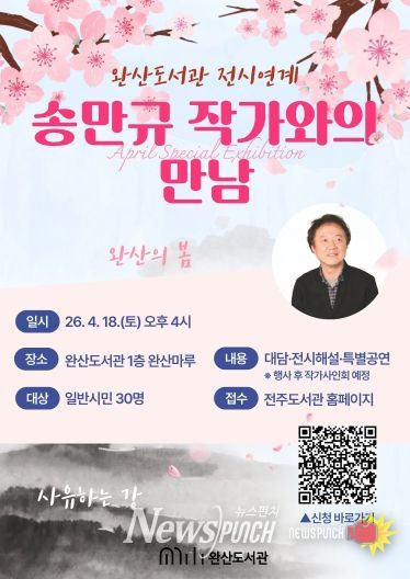뉴스펀치 최영남 기자 | 전주시 완산도서관은 오는 18일 현재 진행 중인 기획전시와 연계해 ‘강의 화가’로 알려진 송만규 작가와 함께하는 ‘작가와의 만남’ 행사를 개최한다.