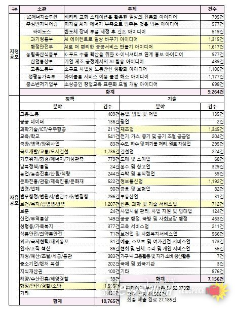 분야별로 살펴보면, 자유공모 정책분야에 가장 많은 10,765건(39.6%)이 접수됐으며, 지정공모 9,264건(34.1%), 자유공모 기술분야 7,156건(26.3%) 순으로 집계됐다.