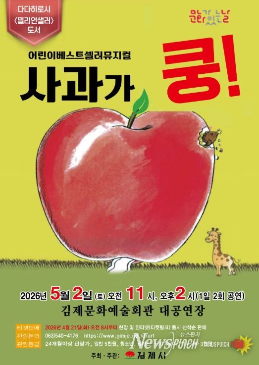 뉴스펀치 정홍균 기자 | 동화 속 세상이 무대위로 뿅~ 베스트셀러이자 스테디셀러인 동화를 각색해 만든 어린이 뮤지컬 <사과가 쿵!~>이 오는 5월 2일 오전 11시, 오후 2시 김제문화예술회관 대공연장에서 펼쳐진다.