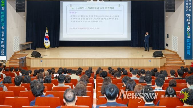 뉴스펀치 최영남 기자 | 전북특별자치도교육청은 6월 3일 치러지는 전국동시지방선거를 앞두고 공무원의 정치적 중립 의무에 대한 이해를 높이고 선거 관련 위법행위를 사전에 예방하기 위해 17일 창조나래 시청각실에서 전 직원 대상 직장교육을 실시했다.