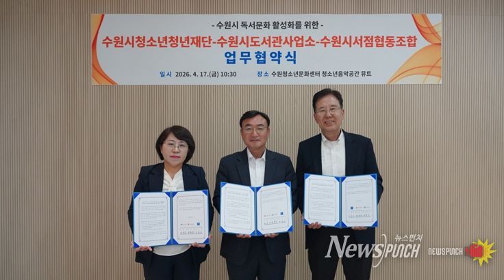 뉴스펀치 박상훈 기자 | 수원시청소년청년재단은 수원시도서관사업소, 수원시서점협동조합과 4월 17일 수원청소년문화센터에서 수원시 독서문화 활성화를 위한 업무협약을 체결했다.