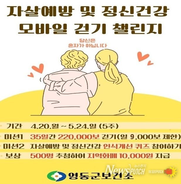 뉴스펀치 이현승 기자 | 충북 영동군보건소는 군민의 정신건강 증진과 자살예방 인식 확산을 위해 ‘자살예방 및 정신건강 인식개선 모바일 걷기 챌린지’를 운영한다고 밝혔다.