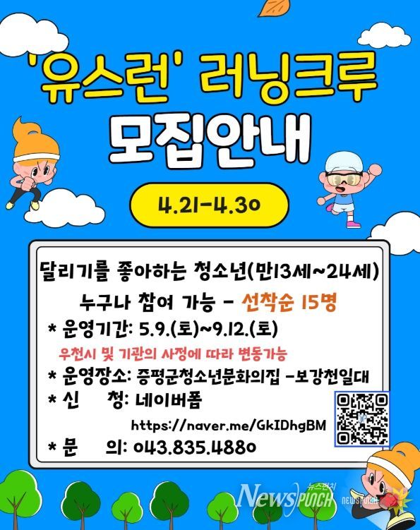 뉴스펀치 이현승 기자 | 충북 증평군청소년문화의집이 청소년들이 직접 기획하고 운영하는 주도형 러닝크루 ‘유스런 러닝크루’를 모집한다.