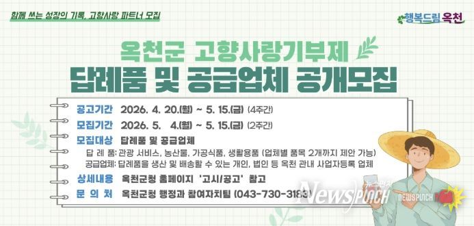 뉴스펀치 이현승 기자 | 옥천군은 20일부터 한 달간 고향사랑기부제 답례품 및 공급업체를 추가 모집한다고 밝혔다.