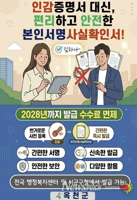 뉴스펀치 이현승 기자 | 옥천군이 인감도장 없이도 간편하게 발급받을 수 있는 ‘본인서명사실확인서’ 이용 활성화에 나서며 군민들의 민원 편의 향상에 박차를 가한다. 특히 2028년까지 수수료 면제 혜택과 함께 전자발급 등 비대면 서비스까지 확대되면서 보다 쉽고 안전한 행정서비스 이용 환경이 마련될 것으로 기대된다.
