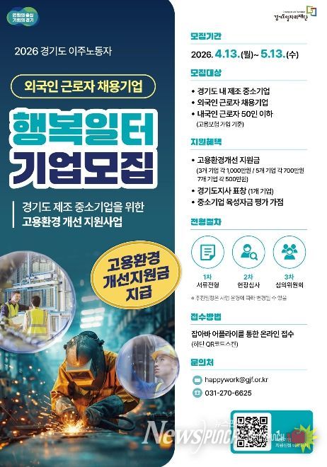 뉴스펀치 박상훈 기자 | 경기도와 경기도일자리재단은 도내 외국인 근로자를 고용한 중소 제조기업을 대상으로 ‘2026년 경기도 이주노동자 행복일터 선정사업’ 참여기업을 모집한다고 20일 밝혔다.