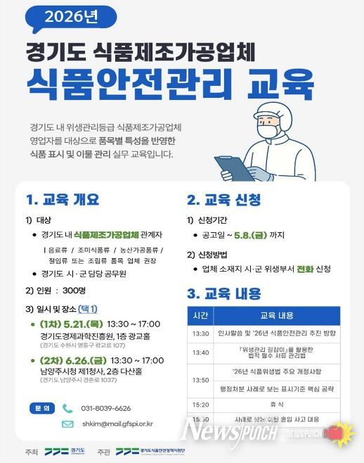 뉴스펀치 박상훈 기자 | 경기도는 도내 식품제조·가공업체의 자율적 위생관리 역량을 강화하기 위해 ‘도내 식품제조·가공업체 위생관리 교육’ 참여자를 모집한다고 20일 밝혔다.