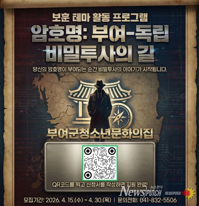 뉴스펀치 이현승 기자 | 부여군시설관리공단 청소년문화의집은 국가보훈부 공모사업에 선정된 2026년 보훈 테마 활동 프로그램 '암호명 부여-독립 비밀투사의 길'에 참여할 청소년을 4월 30일까지 모집한다.