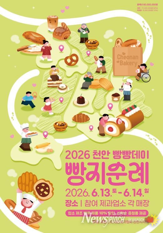 뉴스펀치 이현승 기자 | 천안시는 오는 6월 13일부터 14일까지 이틀간 열리는 ‘2026 천안 빵지순례 빵빵데이’에 참여할 순례단 450팀을 내달 4일까지 모집한다고 20일 밝혔다.