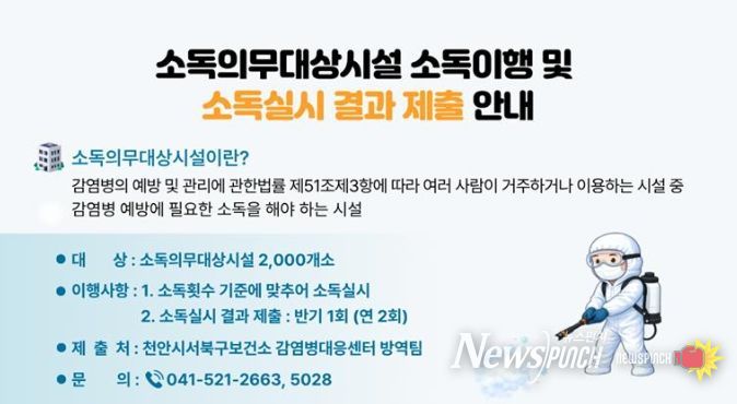 뉴스펀치 이현승 기자 | 천안시는 감염병 예방을 위해 소독의무대상시설을 대상으로 정기 소독 이행 여부에 대한 집중 관리를 실시한다고 20일 밝혔다.