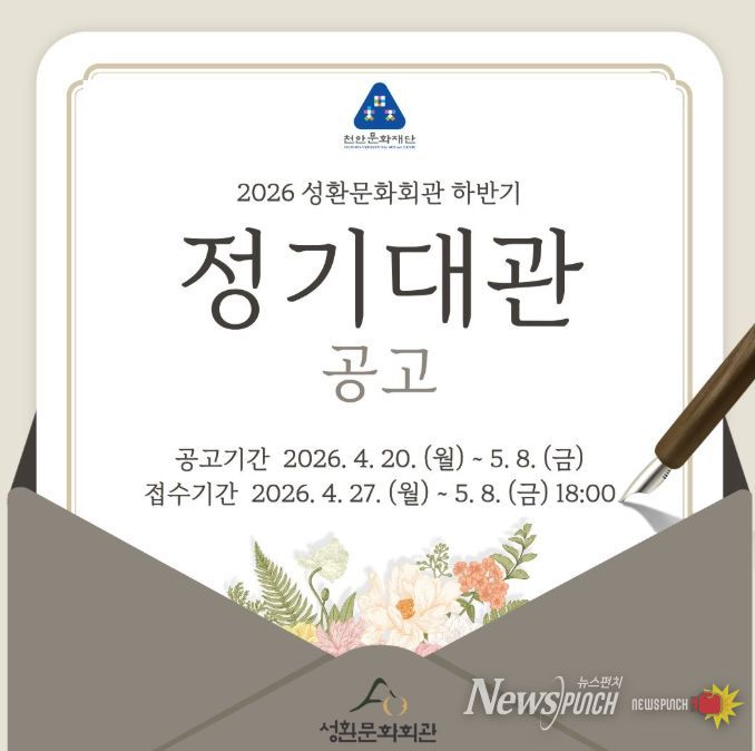 뉴스펀치 이현승 기자 | 천안문화재단은 이달 27일부터 내달 8일까지 성환문화회관 대·소공연장 하반기 정기대관 공모 접수를 진행한다고 20일 밝혔다.