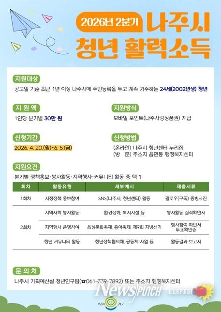 강상구 나주시장 권한대행은 “청년 활력소득은 지역사회 참여를 기반으로 한 정책”이라며 “청년들이 지역과 함께 성장하며 안정적으로 자립할 수 있도록 지속적으로 지원하겠다”고 밝혔다.