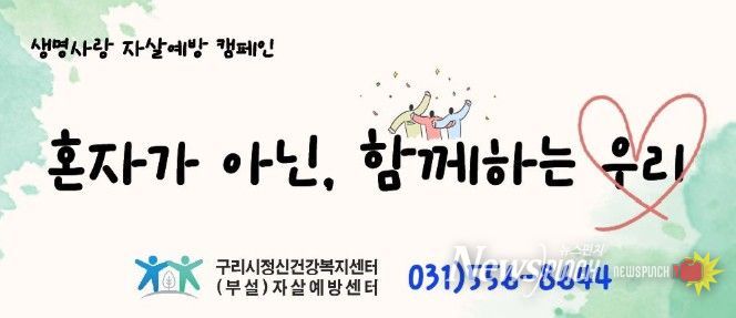 뉴스펀치 박상훈 기자 | 구리시는 자살률이 증가하는 3월부터 5월까지를 ‘생명 사랑 자살 예방 집중 홍보 기간’으로 지정하고, 시민의 소중한 생명을 보호하기 위한 예방 활동을 적극 추진하고 있다고 밝혔다.