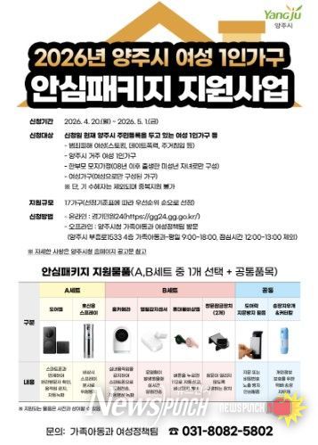 뉴스펀치 박상훈 기자 | 양주시는 관내 여성 1인 가구 등 범죄 취약 여성 가구의 안전한 일상을 지원하기 위해 ‘2026년 양주시 여성 1인 가구 안심패키지 지원사업’을 추진한다.