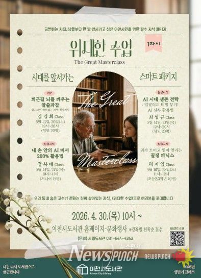 뉴스펀치 박상훈 기자 | 이천시립도서관은 오는 4월 30일부터 2026년 상반기 시민강사 프로그램 ‘위대한 수업’의 1차 수강생을 모집한다고 밝혔다.