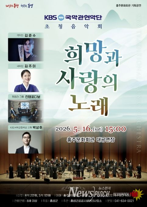 뉴스펀치 이현승 기자 | 홍성군 홍주문화회관은 오는 5월 16일 오후 3시, 가정의 달 특별 기획으로 'KBS국악관현악단 초청음악회 - 희망과 사랑의 노래'를 무대에 올린다.