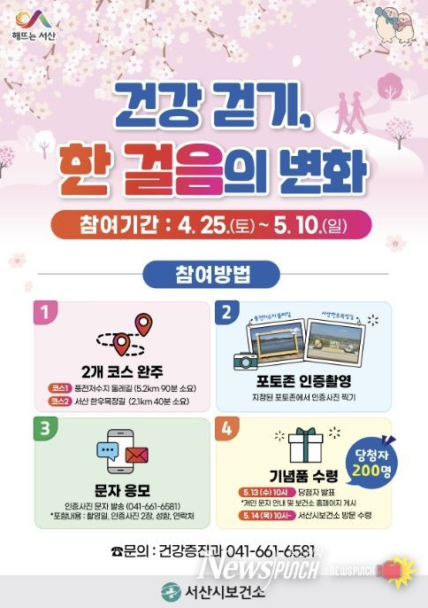 김용란 서산시보건소장은 “걷기는 누구나 쉽게 실천할 수 있는 가장 효과적인 신체활동”이라며 “지난해에 이어 마련한 이번 행사에 많은 시민이 참여해 봄 길을 걸으며 건강도 챙기시길 바란다”라고 말했다.