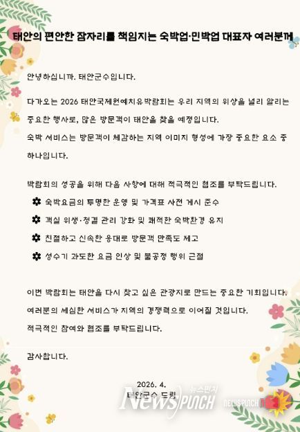 뉴스펀치 이현승 기자 | 태안군이 ‘2026 태안국제원예치유박람회’ 성공을 위해 숙박·민박·외식업 종사자와 지역 리더 등 4천여 명에게 서한문을 발송했다.