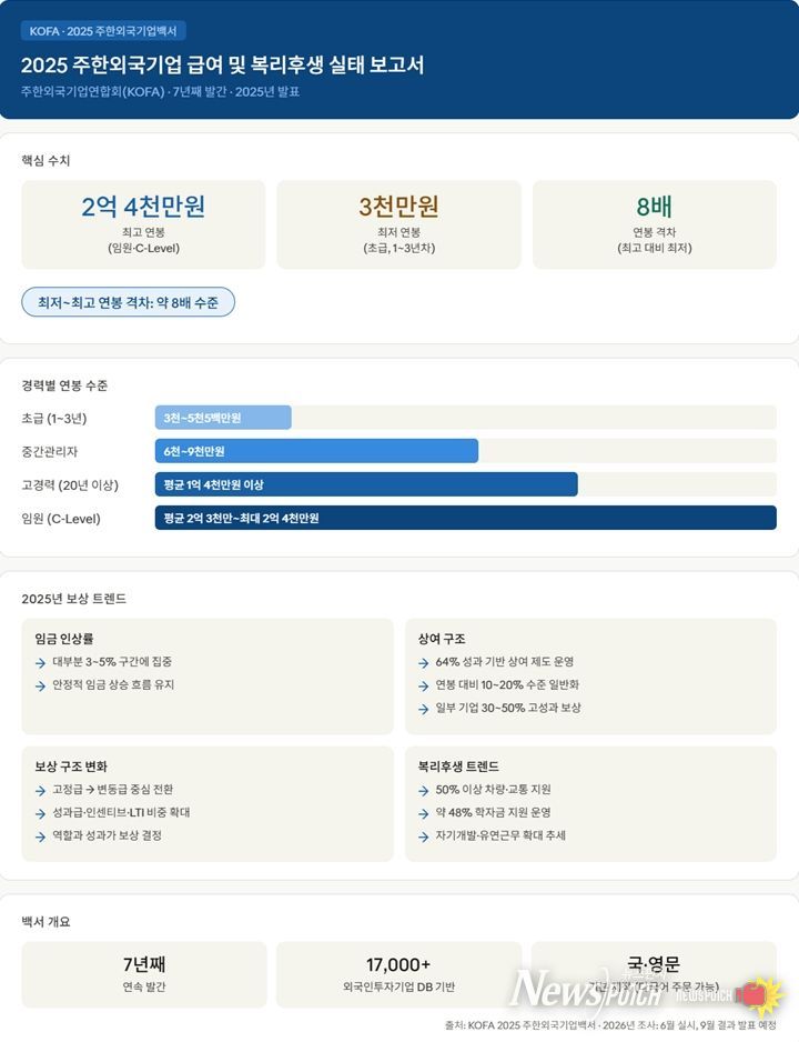 뉴스펀치 조은별 기자 | 주한외국기업연합회(상임대표 김종철, KOFA)는 ‘2025 주한외국기업백서’ 혁신판을 발표하고, 작년 6월 실시한 주한외국기업 급여 및 상여금 실태조사와 함께 복리후생 조사 결과를 포함해 공개했다. 이번 백서는 7년째 발간되는 자료로, 기존 조사 대비 한층 고도화된 분석 체계를 적용해 글로벌 전문 조사기관 수준의 HR 리포트로 업그레이드됐다는 평가를 받고 있다.