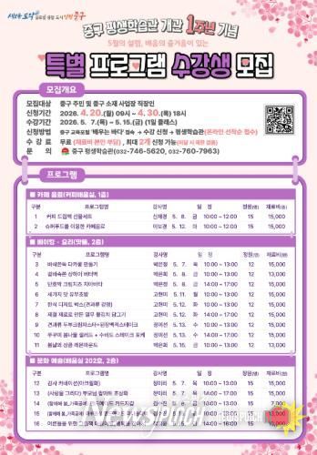 오는 5월 7일부터 15일까지 중구 평생학습관에서 일일 클래스 방식으로 운영될 이번 특강은 카페 음료 만들기, 베이킹·요리, 문화 예술 등 다양한 주제의 총 16개 프로그램으로 구성됐다.