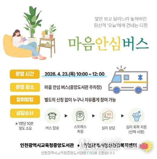 뉴스펀치 정홍균 기자 | 인천광역시교육청중앙도서관은 오는 23일, 인천정신건강복지센터와 협력하여, 지역 시민들을 위한 찾아가는 마음 돌봄 서비스인 ‘마음안심버스’를 운영한다.
