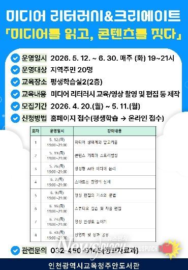 뉴스펀치 정홍균 기자 | 인천광역시교육청주안도서관은 시민의 디지털 역량 강화와 올바른 미디어 활용을 돕기 위해, 5월 12일부터 미디어 리터러시 교육 프로그램 ‘미디어를 읽고, 콘텐츠를 짓다’를 운영한다.