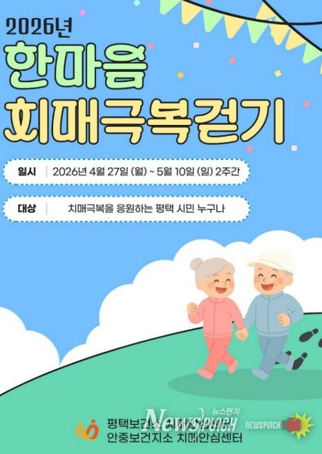 뉴스펀치 박상훈 기자 | 평택보건소 치매안심센터와 안중보건지소 치매안심센터에서는 지역 주민의 치매 예방과 인식개선을 위해 녪년 한마음 치매극복 걷기 행사’를 오는 4월 27일부터 5월 10일까지 2주간 진행한다.
