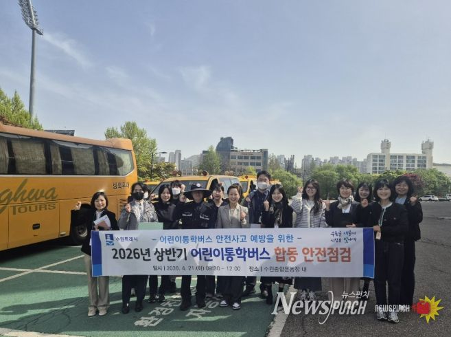 뉴스펀치 박상훈 기자 | 수원특례시는 21일 수원종합운동장 주차구역에서 수원 장안·권선·팔달·영통경찰서, 한국교통안전공단과 함께 ‘2026년 상반기 어린이통학버스 합동 안전점검’을 했다.