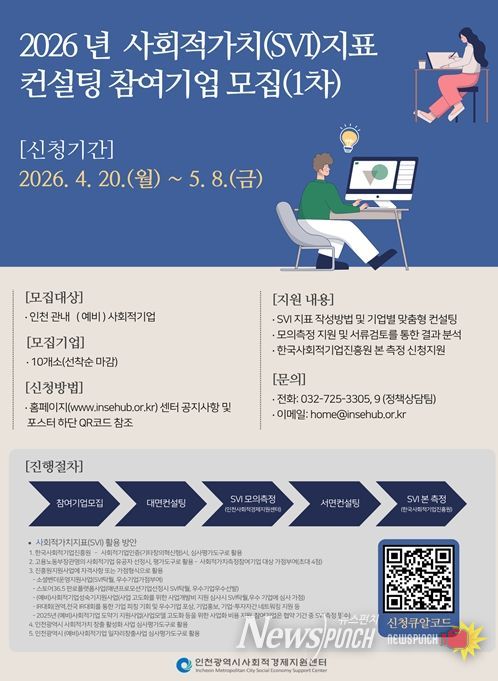 뉴스펀치 정홍균 기자 | 인천광역시는 관내 사회적경제기업의 지속가능한 성장과 사회적 가치 창출 역량 강화를 위해 ‘2026년 사회적가치지표(SVI) 컨설팅(1차)’ 참여기업을 모집한다고 밝혔다.