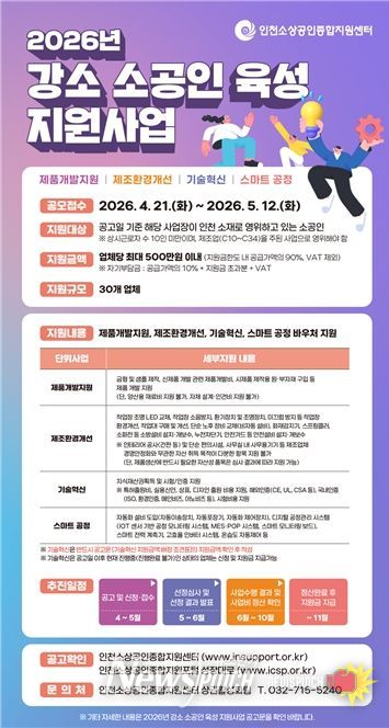 신청 대상은 공고일 기준 인천시에 사업장을 두고 제조업을 주된 업종으로 영위하는 소공인이며, 접수는 4월 21일부터 5월 12일까지 인천소상공인종합지원센터 방문 또는 우편을 통해 가능하다.