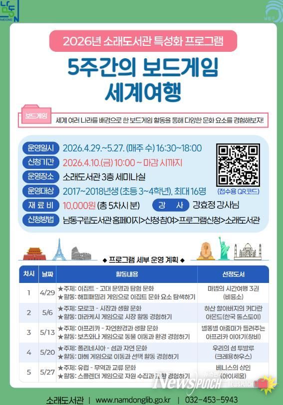 뉴스펀치 정홍균 기자 | 인천시 남동남동구립도서관은 지역주민들에게 다채로운 독서문화 체험의 장을 제공하기 위해 ‘2026년 특성화 프로그램’을 운영한다고 22일 밝혔다.