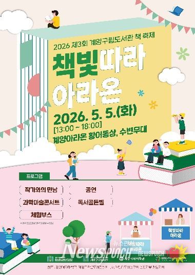 뉴스펀치 정홍균 기자 | (재)인천광역시계양구인재양성장학교육재단 계양구립도서관은 어린이날인 5월 5일 오후 1시부터 6시까지 계양아라온 황어동상 및 수변무대 일원에서 ‘제3회 계양구립도서관 책 축제 '책빛따라 아라온'’을 개최한다고 밝혔다.