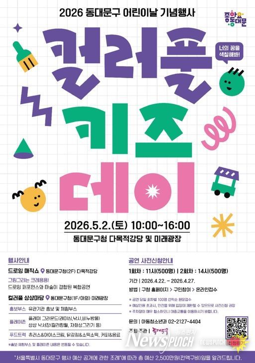 먼저 어린이날을 기념해 5월 2일 동대문구청 2층 다목적강당 및 1층 미래광장에서 2026년 어린이날 기념행사 '컬러풀 키즈데이'를 개최한다.
