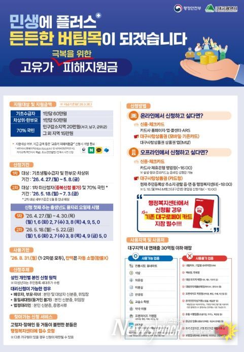 지원금은 유흥·사행업종을 제외한 대구광역시 내 연매출 30억원 이하 소상공인 매장에서 사용 가능하며, 사용기한은 8월 31일까지로 기한 내 미사용 금액은 자동 소멸된다.