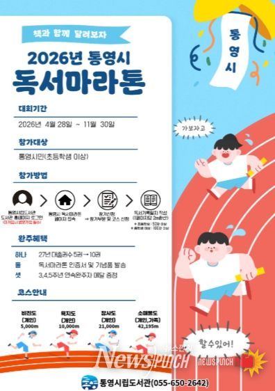 뉴스펀치 박세훈 기자 | 통영시립도서관은 지속적인 독서활동 권장을 통한 독서문화 저변 확대를 위해 오는 28일부터 11월 30일까지 '2026년 통영시 독서마라톤 대회'를 진행한다.