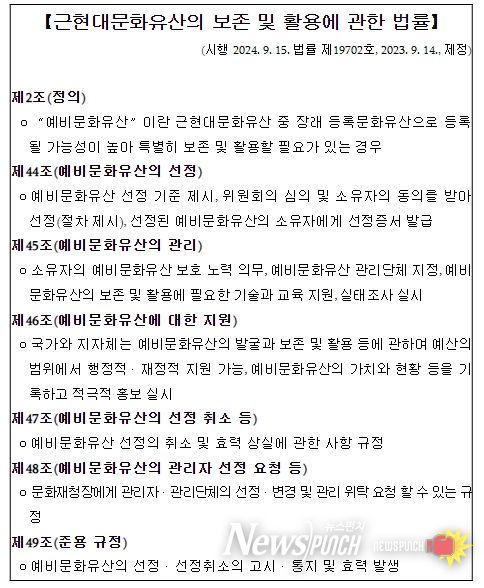 뉴스펀치 김희경 기자 | 문화재청은 올해 9월부터 '근현대문화유산의 보존 및 활용에 관한 법률'에 따라 50년 미만의 현대문화유산까지 보존·관리가 가능한 ‘예비문화유산’ 제도를 처음 시행한다.
