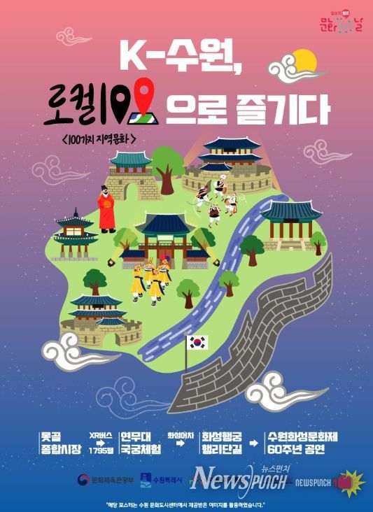 수원의 ‘로컬100’인 ‘수원화성문화제’는 수원화성을 중심으로 정조의 애민사상을 담은 전통재현행사이자, 수원시민이 참여하는 역사문화축제이다. 또한 ‘요새화성요즘행궁’은 수원시를 대표하는 ‘수원화성’과 ‘행궁동’을 주제로 수원문화재단이 개발한 ‘관광브랜드’이다. ‘요새화성’은 성곽으로서의 ‘요새’와 요사이의 ‘요새’를 중의적으로 담아 수원화성의 전통적인 아름다움을 이미지로 표현한 것이고, ‘요즘행궁’은 행궁동의 공방거리, 벽화, 먹거리(통닭 등) 등 수원의 체험문화를 함축적으로 표현한 것이다. ‘수원편’에서는 수원화성, 수원행궁, 수원화성관광특구 등을 연계한 지역 콘텐츠를 체험할 수 있다.