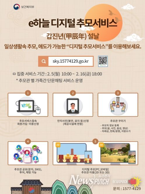 뉴스펀치 장은영 기자 | 보건복지부는 설날 연휴를 맞아 고인을 추모하고 가족과 친지, 지인 간 비대면 소통이 가능한 「디지털 추모서비스」 기능을 고도화하여 제공한다고 밝혔다.