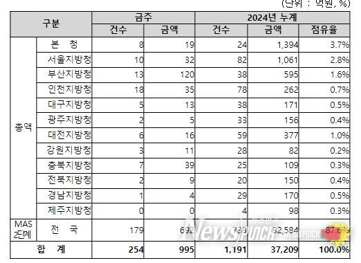 지역별 발주량을 보면, 총액계약 대상 303억 원 중 본청이 19억 원으로 6.3%를 집행하고 서울청 등 11개 지방청에서 284억 원을 각각 집행할 예정이다.