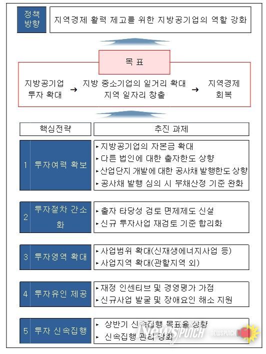 또한, 지방공기업 투자 활성화 실무 추진단을 구성하여 노하우 등이 부족한 지방공기업을 대상으로 신규사업 기획을 지원하고, 해결하기 어려운 장애요인을 해소해주어 투자가 차질없이 이루어지도록 할 계획이다.