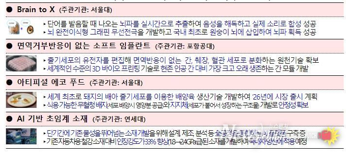 뉴스펀치 장은영 기자 | ‘생각만 해도 다른 사람과 소통할 수 있을까?’(Brain to X), ‘줄기세포로 사람 몸에 이식할 수 있는 인공장기를 만들 수는 없을까?’(면역거부반응이 없는 소프트 임플란트), ‘줄기세포를 배양해서 가축과 똑같은 고기(배양육)를 만들 수는 없을까?’(아티피셜 에코 푸드), ‘기존 물성을 뛰어넘는 미래 소재를 인공지능(AI)으로 설계할 수 있을까?’(AI 기반 초임계 소재)