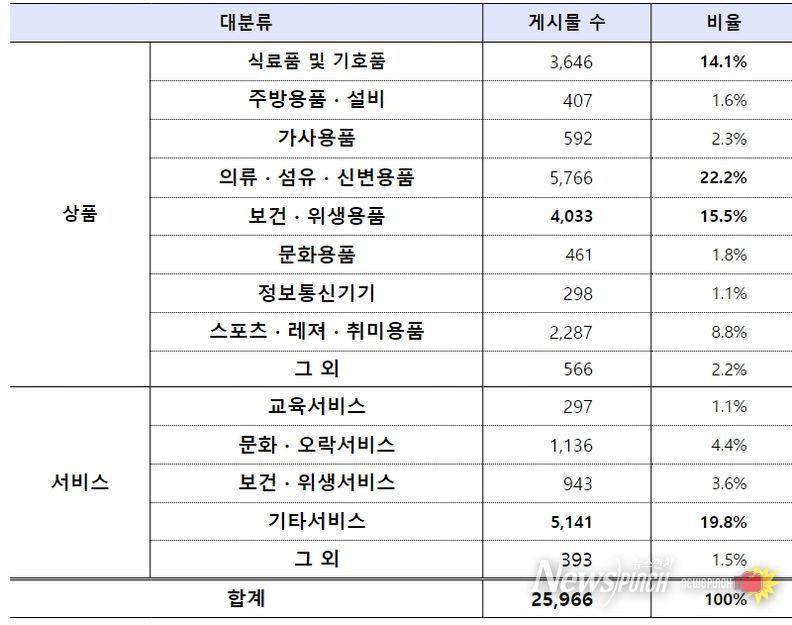 주요 법 위반 의심 게시물의 상품·서비스군은 의류·섬유·신변용품 중 간편복, 기타서비스 중 음식서비스, 보건·위생용품 중 화장품, 식료품 및 기호품 중 건강기능식품 분야에서 비중이 높은 것으로 나타났다.