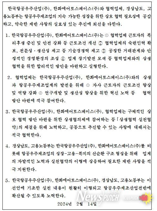 뉴스펀치 장은영 기자 | 경남지역 항공우주제조업 분야에서 원·하청 간 생산과 노동에 대한 상생협력이 확산된다. 고용노동부와 한화에어로스페이스(주), 한국항공우주산업(주), 경상남도는 2월 14일 한화그룹 본사에서 ‘항공우주제조업 상생협력 확산을 위한 공동선언식’을 개최*했다.